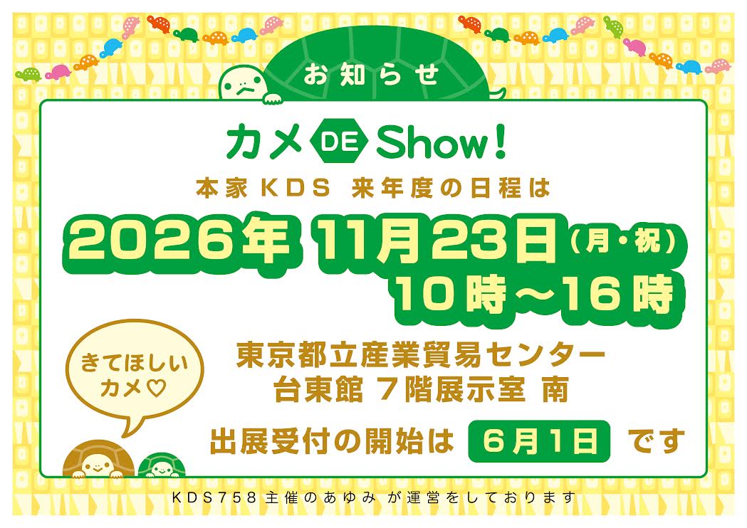 カメ DE Show!in 名古屋 ![]() 2026年3月15日(日)10:00〜16:00 名古屋市中小企業振興会館にて開催 https://kamedeshow.wixsite.com/nagoya 詳しくは上記サイトにてご確認ください |
